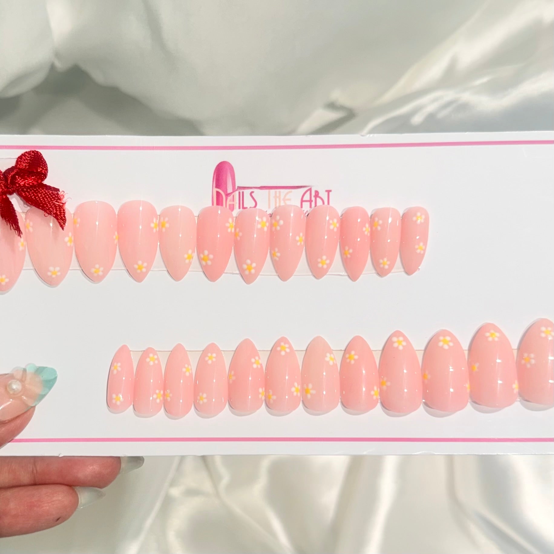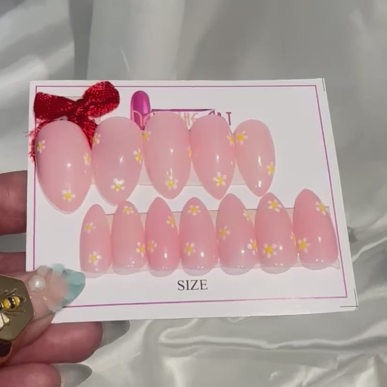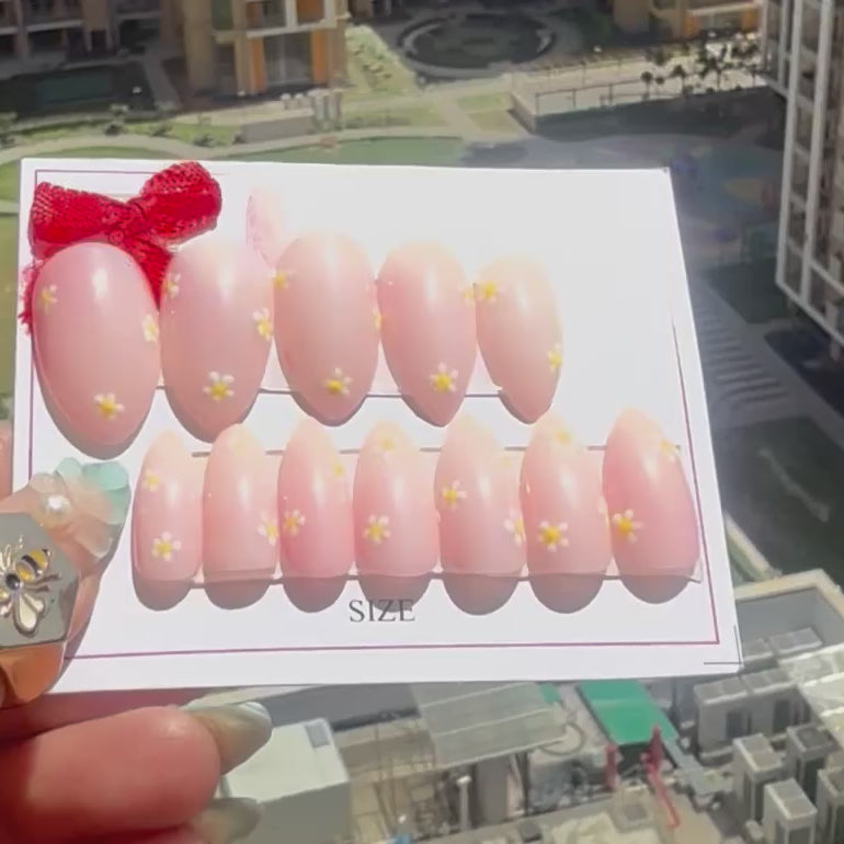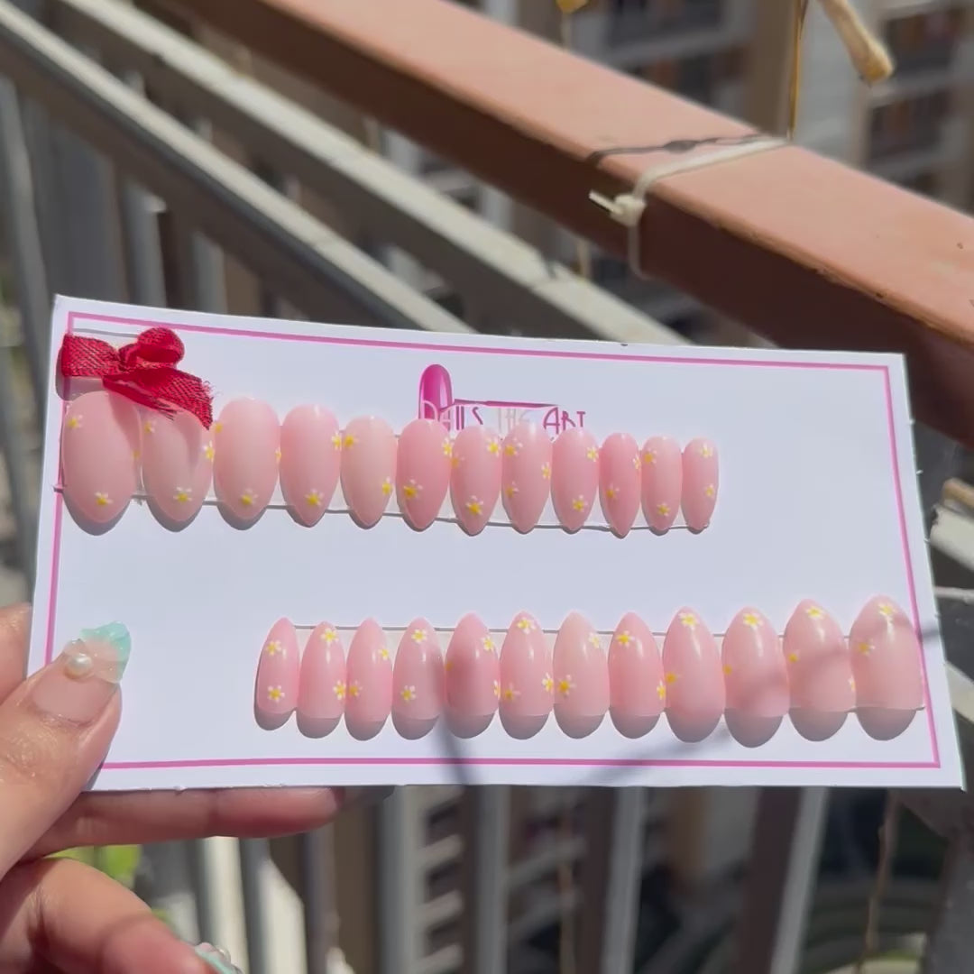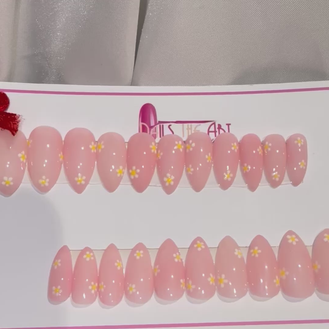 Elevate your look with these blush pink glossy press-on nails, beautifully designed with tiny hand-painted daisy flowers. The high-shine finish adds a fresh, elegant glow, making this set perfect for everyday wear, brunch dates, or a soft aesthetic look.