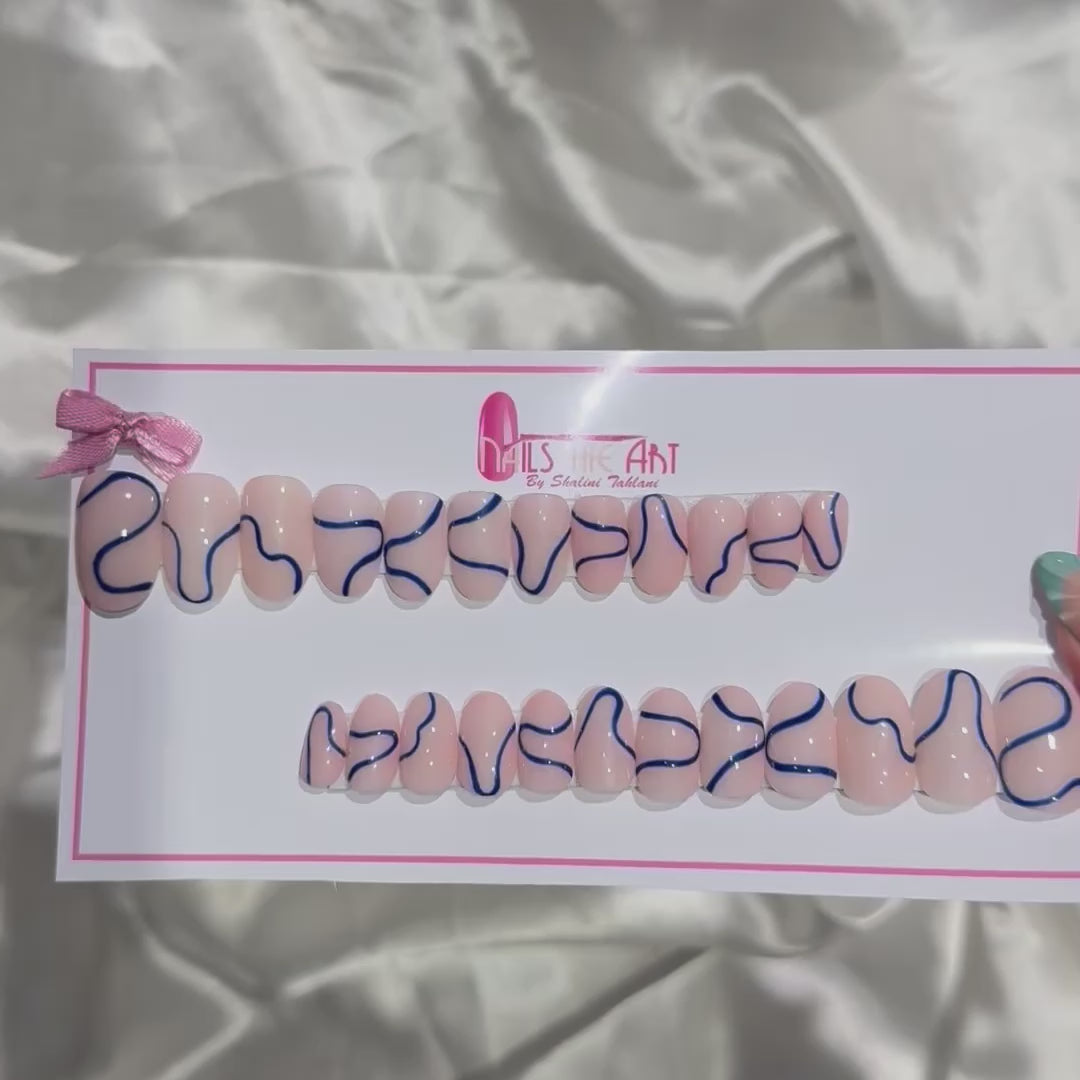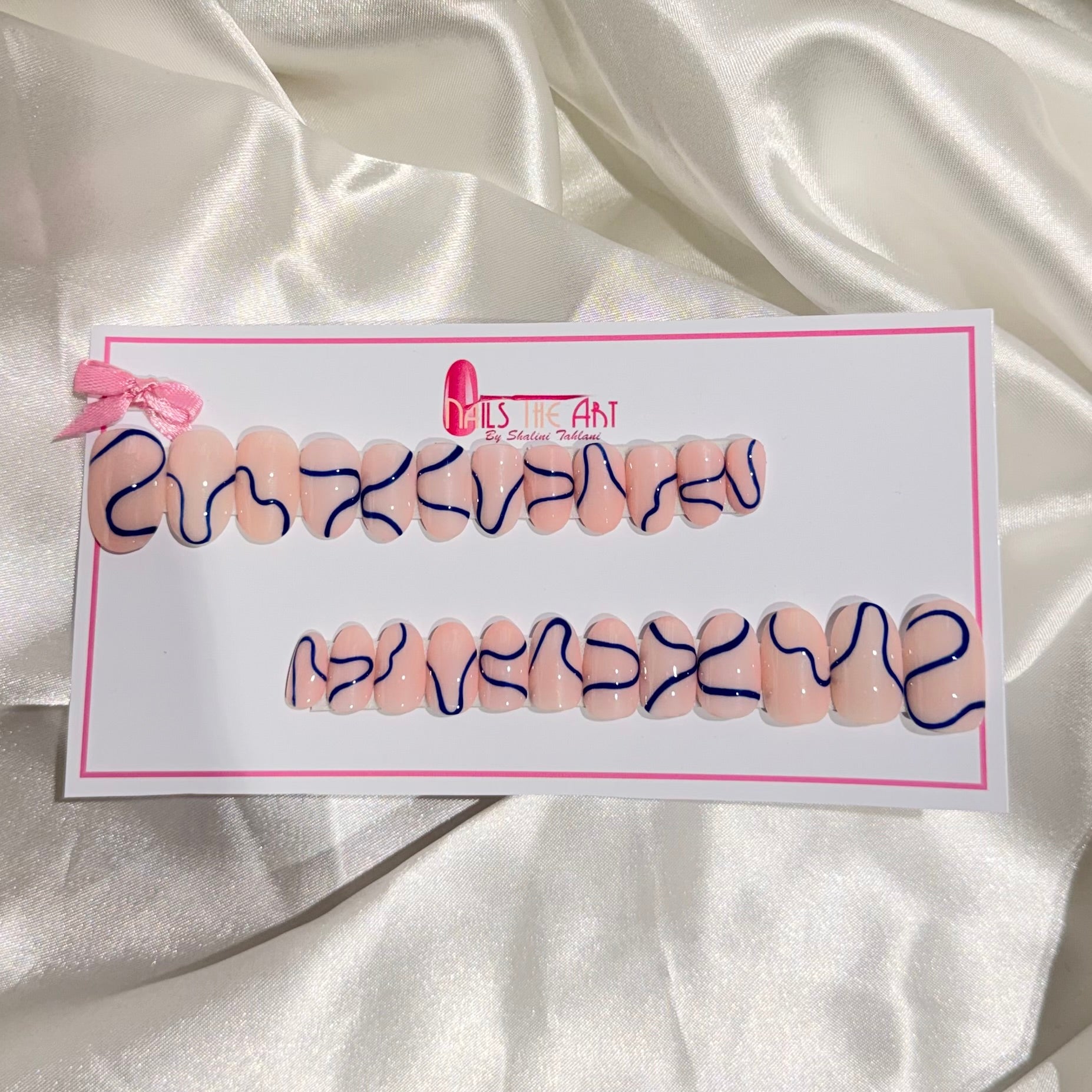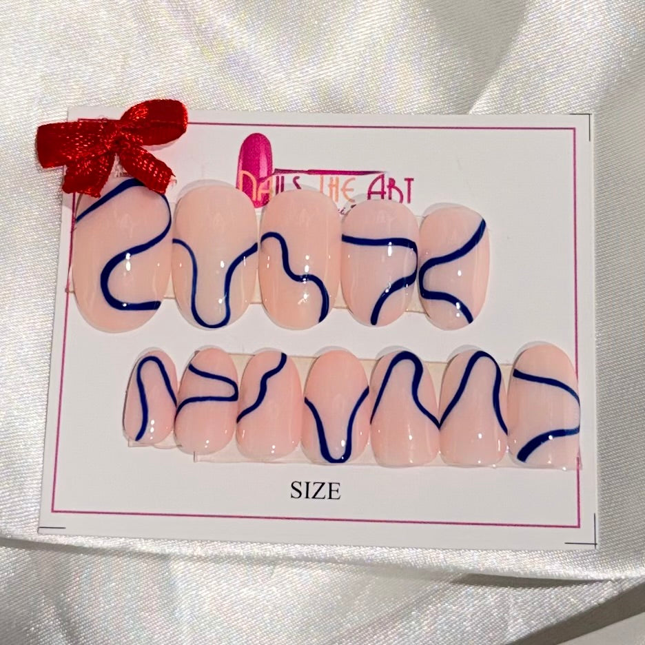 Elevate your nail game with this elegant nude press-on nail set featuring bold midnight blue abstract swirl detailing. The soft nude base paired with sleek wavy lines creates a modern, chic look perfect for everyday glam or special occasions. Handmade with premium quality finish for a salon-like experience at home.